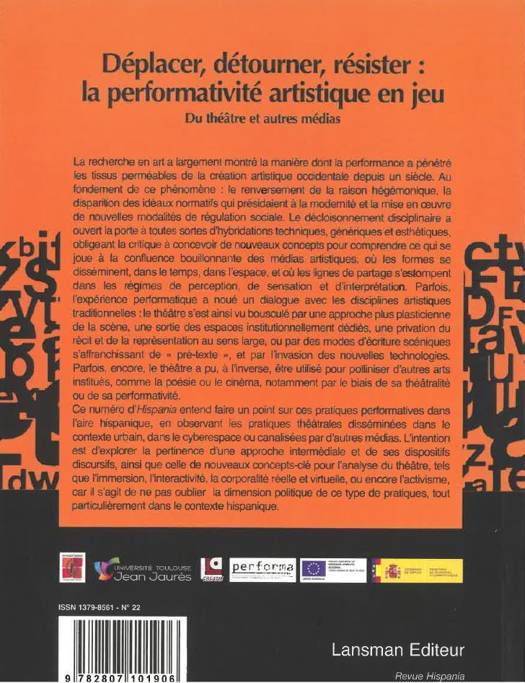 La recherche en art a largement montré la manière dont la performance a pénétré les tissus perméables de la création artistique occidentale depuis un siècle. Au fondement de ce phénomène : le renversement de la raison hégémonique, la disparition des idéaux normatifs qui présidaient à la modernité et la mise en œuvre de nouvelles modalités de régulation sociale. Le décloisonnement disciplinaire a ouvert la porte à toutes sortes d’hybridations techniques, génériques et esthétiques, obligeant la critique à concevoir de nouveaux concepts pour comprendre ce qui se joue à la confluence bouillonnante des médias artistiques, où les formes se disséminent, dans le temps, dans l’espace, et où les lignes de partage s’estompent dans les régimes de perception, de sensation et d’interprétation. Parfois, l’expérience performatique a noué un dialogue avec les disciplines artistiques traditionnelles : le théâtre s’est ainsi vu bousculé par une approche plus plasticienne de la scène, une sortie des espaces institutionnellement dédiés, une privation du récit et de la représentation au sens large, ou par des modes d’écriture scéniques s’affranchissant de « pré-texte », et par l’invasion des nouvelles technologies. Parfois, encore, le théâtre a pu, à l’inverse, être utilisé pour polliniser d’autres arts institués, comme la poésie ou le cinéma, notamment par le biais de sa théâtralité ou de sa performativité.