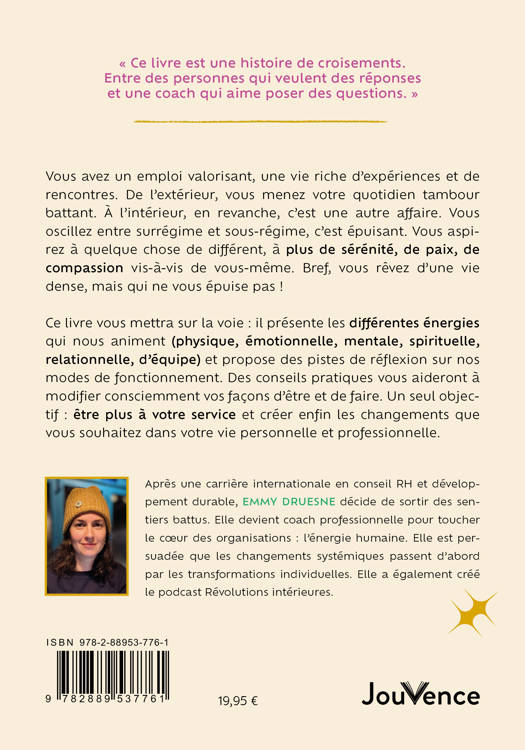 Ce livre vous mettra sur la voie : il présente les différentes énergies qui nous animent (physique, émotionnelle, mentale, spirituelle, relationnelle, d’équipe) et propose des pistes de réflexion sur nos modes de fonctionnement. Des conseils pratiques vous aideront à modifier consciemment vos façons d’être et de faire. Un seul objectif : être plus à votre service et créer enfin les changements que vous souhaitez dans votre vie personnelle et professionnelle.