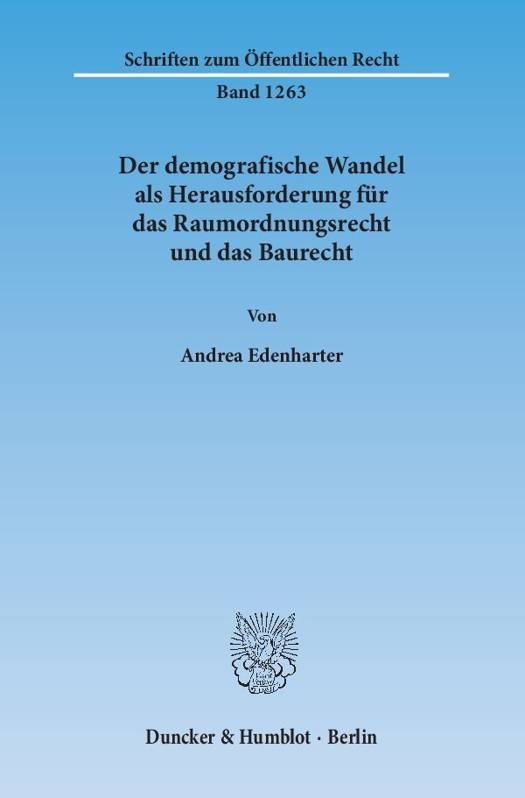 Andrea Edenharter beschäftigt sich mit der Frage, welche Lösungen das Raumordnungsrecht, das Städtebaurecht und das Bauordnungsrecht für die durch den demografischen Wandel hervorgerufenen Probleme gegenwärtig bereithalten. Ausgangspunkt der Untersuchung, welche auch die verfassungsrechtlichen Vorgaben mit in den Blick nimmt, sind die bestehenden gesetzlichen und planerischen Regelungen. Die Analyse kommt zu dem Ergebnis, dass die geltenden Vorschriften des Raumordnungsrechts die Herausforderungen des demografischen Wandels durchaus im Blick haben, insgesamt aber nur über eine begrenzte Steuerungswirkung verfügen. Hinsichtlich des Städtebaurechts zeigt sich, dass die vorhandenen Regelungen kaum ausreichen, um die Probleme des demografischen Wandels in den Griff zu bekommen. Auch das Bauordnungsrecht eignet sich nur bedingt, um Herausforderungen, wie dem Verfall von Gebäuden, wirksam zu begegnen.