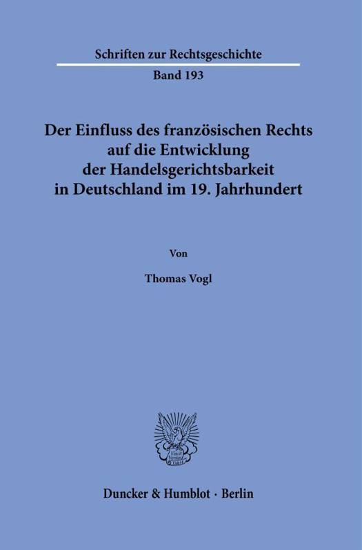 In der Literatur wird teilweise behauptet, dass es einen geringen Einfluss des franzosischen Rechts auf die Entwicklung der deutschen Handelsgerichtsbarkeit gab. Tatsachlich unterscheiden sich die heutigen Kammern fur Handelssachen des GVG stark von den franzosischen Handelsgerichten. Entsprechende Aussagen werden allerdings in den wenigen Werken zur Geschichte der Handelsgerichtsbarkeit nicht genauer begrundet. Thomas Vogl nimmt daher diese Behauptungen zum Anlass, sich konkret mit dem Einfluss des franzosischen Rechts auf die Entwicklung der Handelsgerichtsbarkeit in Deutschland im 19. Jahrhundert zu beschaftigen. Dafur vergleicht er insbesondere die Napoleonische Gesetzgebung zu den Handelsgerichten mit den deutschen Handelsgerichtsordnungen bzw. Gerichtsverfassungsgesetzen des 19. Jahrhunderts. Im Zuge dessen zeigt er die verschiedenen Entwicklungsstrange in Deutschland in der Zeit von 1814 bis zur Einfuhrung des GVG auf.
