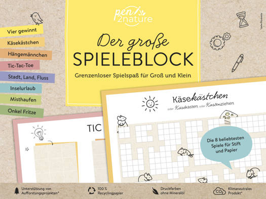Alle Bücher und Blöcke wurden mit Farben auf Pflanzenöl-Basis und auf 100 % Recyclingpapier gedruckt. Der Verlag pen2nature unterstützt Klimaschutzprojekte und spendet 10 Cent pro Produkt für die Pflanzung neuer Bäume in heimischen Wäldern.
