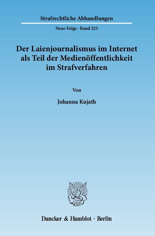 Die Autorin untersucht die Medienöffentlichkeit im Strafverfahren aus dem völlig neuen Blickwinkel der im Internet publizierenden Laienjournalisten. Diese sind aufgrund der technischen Entwicklung in der Lage, Beiträge mit großer Breitenwirkung zu publizieren und sind ein vom Meinungsmarkt nicht mehr wegzudenkender Faktor.