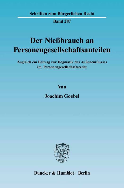 Der Nießbrauch ist ein traditionsreiches Instrument der Privatrechtsordnung. Als dingliche Form der Nutzungsüberlassung gibt es für ihn in der Praxis mangels gleichwertiger Konstruktionsmöglichkeiten auch bei vollhaftenden Anteilen an einer Personengesellschaft keine Alternativen. Der Nießbrauch situiert hier im Schnittfeld nießbrauchs- und gesellschaftsrechtlicher Wertungen. Die Komplexität der Dogmatik wird dadurch enorm erhöht. Kaum ein Satz ist unbestritten. Dies beginnt bei der Frage nach der Zulässigkeit des Instituts, führt zu Schwierigkeiten in der Konstruktion des Nießbrauchstatbestands und endet bei einem Konglomerat diffiziler Rechtsfolgeprobleme. Es liegt daher nahe, monographisch die Voraussetzungen und Grenzen dieser Rechtsfigur näher zu studieren. Der Verfasser widmet sich dabei vor allem grundlegenden, bislang oft vernachlässigten Fragen der Dogmatik. Im Focus steht vor allem der Vorbehalts- und der Versorgungsnießbrauch und dort insbesondere die Verteilung der vermögensrechtlichen und mitverwaltungsrechtlichen Rechte, der mitgliedschaftlichen Pflichten, der Außenhaftung und der Verlusttragung.