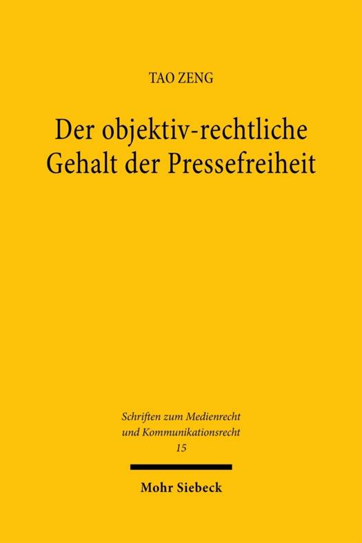 Das Institut "freie Presse" bzw. die "institutionelle Eigenstandigkeit der Presse" bilden in der Rechtsprechung des Bundesverfassungsgerichts fest verankerte Termini, wenn es um die dogmatische Konturierung der Pressefreiheit geht. Tao Zeng hinterfragt die objektiv-rechtlichen Deutungen der Pressefreiheit in Rechtsprechung und Literatur und zeigt die damit einhergehenden Probleme auf. Anschliessend schlagt er eine Rekonstruktion des objektiv-rechtlichen Gehalts der Pressefreiheit aus verfassungstheoretisch wie auch dogmatisch fundierter Perspektive vor. Damit erzielt er eine grossere Klarheit des objektiv-rechtlichen Gehalts der Pressefreiheit im Hinblick auf ihre Begrundung und die konkreten Konsequenzen dieser dogmatischen Figur.