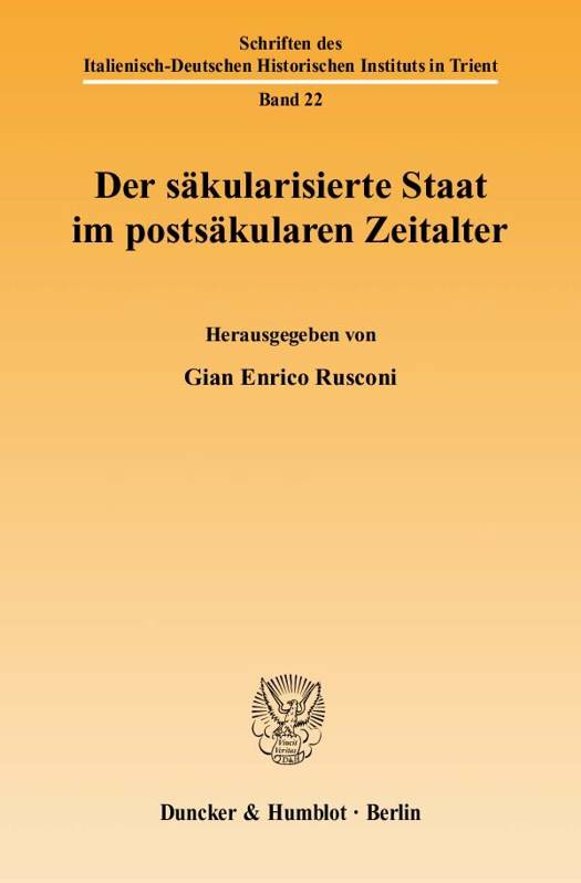 "Der säkularisierte Staat im postsäkularen Zeitalter" versammelt die Beiträge der 49. Studienwoche des Italienisch-Deutschen Historischen Instituts in Trient, die im Oktober 2006 stattfand. Der Titel unterscheidet sich etwas von der Tagung - ihr Thema lautete: "Der säkularisierte Staat und seine Veränderungen heute". Diese Änderung könnte geringfügig erscheinen, sie ist aber bedeutsam, denn der Bezug auf das postsäkulare Zeitalter bezeichnet präziser nicht nur den Kontext, sondern auch die Dynamik der Wandlungsprozesse des säkularisierten Staates.