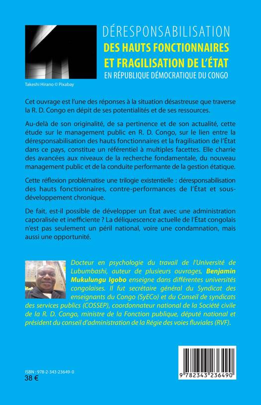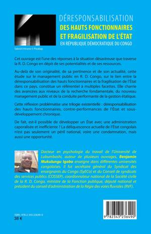 Cet ouvrage est l'une des réponses à la situation désastreuse que traverse la R. D. Congo en dépit de ses potentialités et de ses ressources. Cette réflexion problématise une trilogie existentielle: déresponsabilisation des hauts fonctionnaires, contre-performances de l'État et sous développement chronique. De fait, est-il possible de développer un État avec une administration caporalisée et inefficiente ? La déliquescence actuelle de l'État congolais n'est pas seulement un péril national, voire une condamnation, mais aussi une opportunité.