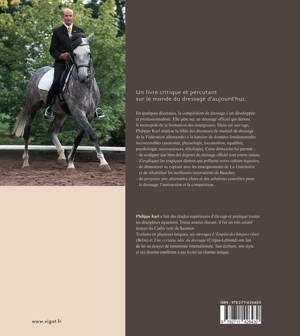 Un livre critique et percutant sur le monde du dressage d’aujourd’hui. En quelques décennies, la compétition de dressage s’est développée et professionnalisée. Elle pèse sur un dressage officiel qui détient le monopole de la formation des enseignants. Dans cet ouvrage, Philippe Karl analyse la bible des dresseurs (le manuel de dressage de la Fédération allemande) à la lumière de données fondamentales incontestables (anatomie, physiologie, locomotion, équilibre, psychologie, neurosciences, éthologie). Cette démarche lui permet : – de souligner que bien des dogmes du dressage officiel sont contre nature, – d’expliquer les tragiques dérives qui polluent notre culture équestre, – de démontrer sa rupture avec les enseignements de La Guérinière et de réhabiliter les meilleures innovations de Baucher, – de proposer une alternative claire et des solutions concrètes pour le dressage, l’instruction et la compétition.