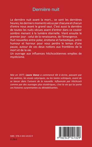 La dernière nuit avant la mort, ce sont les dernières heures, les derniers moments avant le grand saut. Vient ensuite le premier jour : celui de la renaissance, de l'émergence. Cet ouvrage est composé de huit nouvelles entre polar, érotisme et fantastique, entre humour et horreur pour vous perdre le temps d'une pause, autour de ces deux notions aux frontières de la mort et de la vie.
