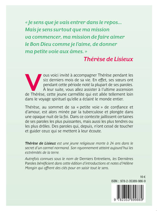 Vous voici invité à accompagner Thérèse pendant les six derniers mois de sa vie. En effet, ses sœurs ont pendant cette période noté la plupart de ses paroles. À leur suite, vous allez assister à l’ultime ascension de Thérèse, cette jeune carmélite qui est allée tellement loin dans le voyage spirituel qu’elle a éclairé le monde entier. Thérèse, au sommet de sa « petite voie » de confiance et d’amour, est alors minée par la tuberculose et plongée dans une opaque nuit de la foi. Dans ce contexte jaillissent certaines de ses paroles les plus puissantes, mais aussi les plus tendres ou les plus drôles. Des paroles qui, depuis, n’ont cessé de toucher et guider ceux qui se mettent à leur écoute.