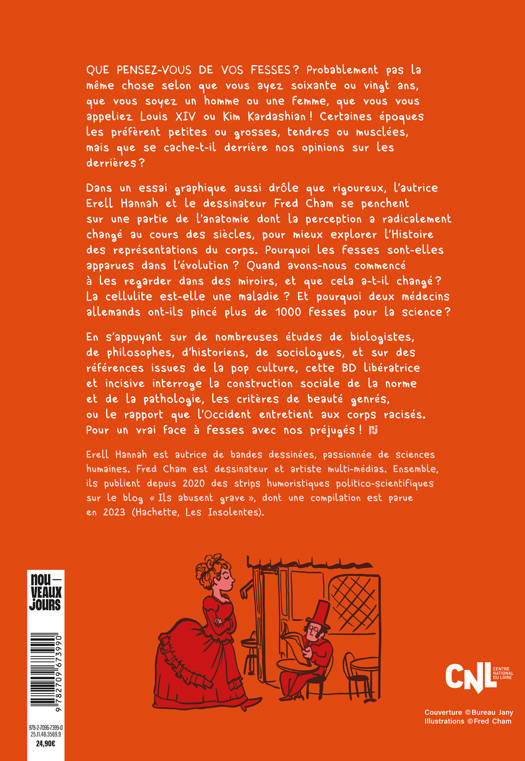 Dans un essai graphique aussi drôle que rigoureux, l’autrice Erell Hannah et le dessinateur Fred Cham se penchent sur une partie de l’anatomie dont la perception a radicalement changé au cours des siècles, pour mieux explorer l’Histoire des représentations du corps. Pourquoi les fesses sont-elles apparues dans l’évolution ? Quand avons-nous commencé à les regarder dans des miroirs, et que cela a-t-il changé ? La cellulite est-elle une maladie ? Et pourquoi deux médecins allemands ont-ils pincé plus de 1000 fesses pour la science ?