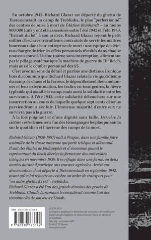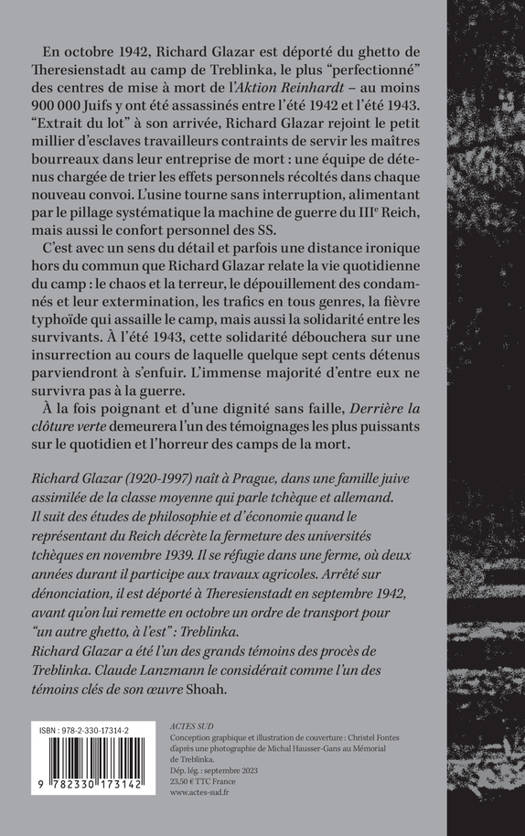En octobre 1942, Richard Glazar est déporté du ghetto de Theresienstadt au camp de Treblinka, le plus "perfectionné" des centres de mise à mort de l'"Aktion Reinhardt" - au moins 900 000 Juifs y ont été assassinés entre l'été 1942 et l'été 1943. "Extrait du lot" à son arrivée, Richard Glazar rejoint le petit millier d'esclaves travailleurs contraints de servir les maîtres bourreaux dans leur entreprise de mort : une équipe de détenus chargée de trier les effets personnels récoltés dans chaque nouveau convoi. L'usine tourne sans interruption, alimentant par le pillage systématique la machine de guerre du IIIe Reich, mais aussi le confort personnel des SS. C'est avec un sens du détail et parfois une distance ironique hors du commun que Richard Glazar relate la vie quotidienne du camp : le chaos et la terreur, le dépouillement des condamnés et leur extermination, les trafics en tous genres, la fièvre typhoïde qui assaille le camp, mais aussi la solidarité entre les survivants. À l'été 1943, cette solidarité débouchera sur une insurrection au cours de laquelle quelque sept cents détenus parviendront à s'enfuir. L'immense majorité d'entre eux ne survivra pas à la guerre. À la fois poignant et d'une dignité sans faille, "Derrière la clôture verte" demeurera l'un des témoignages les plus puissants sur le quotidien et l'horreur des camps de la mort.