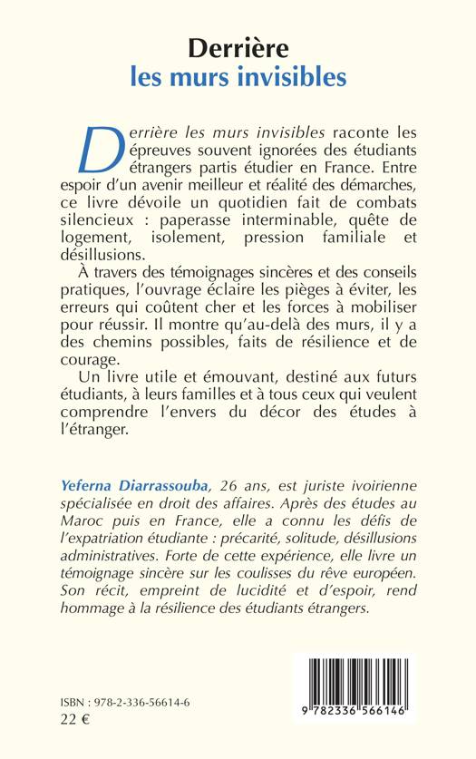Derrière les murs invisibles raconte les épreuves souvent ignorées des étudiants étrangers partis étudier en France. Entre espoir d'un avenir meilleur et réalité des démarches, ce livre dévoile un quotidien fait de combats silencieux: paperasse interminable, quête de logement, isolement, pression familiale et désillusions. À travers des témoignages sincères et des conseils pratiques, l'ouvrage éclaire les pièges à éviter, les erreurs qui coûtent cher et les forces à mobiliser pour réussir. Il montre qu'au-delà des murs, il y a des chemins possibles, faits de résilience et de courage. Un livre utile et émouvant, destiné aux futurs étudiants, à leurs familles et à tous ceux qui veulent comprendre l'envers du décor des études à l'étranger.