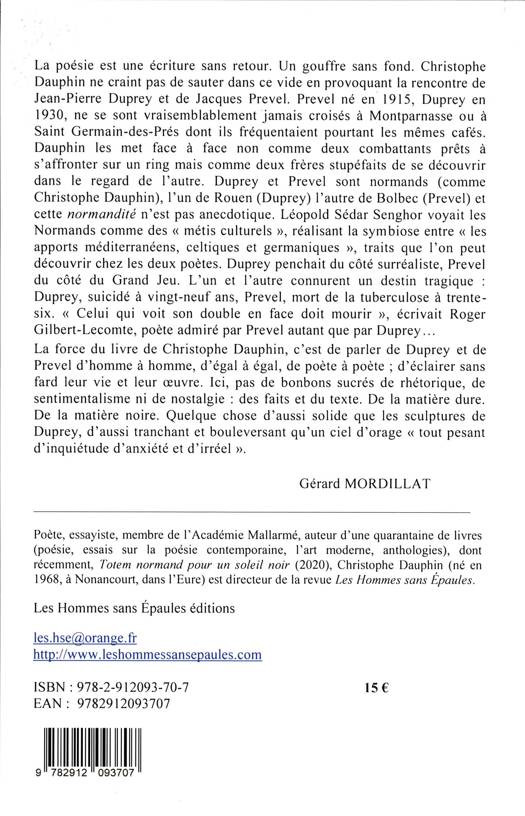 La force du livre de Christophe Dauphin, c’est de parler de Duprey et de Prevel d’homme à homme, d’égal à égal, de poète à poète ; d’éclairer sans fard leur vie et leur œuvre. Ici, pas de bonbons sucrés de rhétorique, de sentimentalisme ni de nostalgie : des faits et du texte. De la matière dure. De la matière noire. Quelque chose d’aussi solide que les sculptures de Duprey, d’aussi tranchant et bouleversant qu’un ciel d’orage « tout pesant d’inquiétude d’anxiété et d’irréel ».