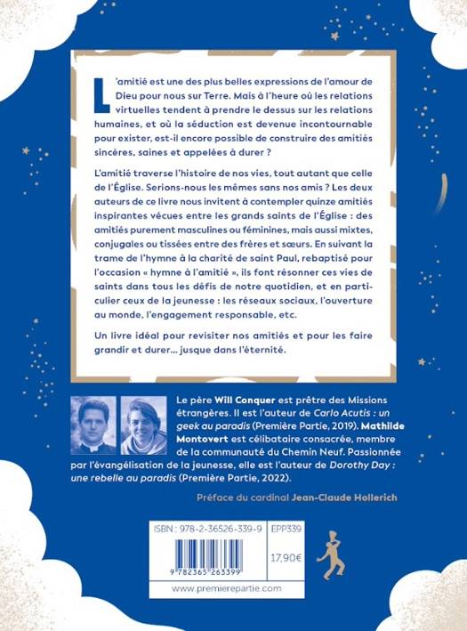 L'amitié est une des plus belles expressions de l'amour de Dieu pour nous sur Terre. Jésus lui-même et de nombreux saints ont vécu des relations d'amitié fortes et profondes, ancrées dans la foi. Mais à l'heure où les relations virtuelles ont pris le dessus sur les relations humaines, où la séduction est devenue un incontournable pour exister, où les références à la sexualité et l'érotisation viennent remplir notre quotidien, est-il encore possible de construire de véritables relations d'amitiés, appelées à durer et jusque dans l'éternité ? L'amitié homme/femme d'ailleurs a-t-elle encore une place dans notre société ? Le père Will Conquer (MEP) et Mathilde Montovert (Chemin Neuf) viennent apporter une réponse à cette question qui jaillit du coeur des jeunes en quête d'amitiés profondes. Au travers de 15 célèbres duos d'amitiés de l'Église, mixtes, féminins et masculins, nos auteurs proposent de nombreuses clés de réflexion et d'action pour bâtir des amitiés solides ancrées en Christ.