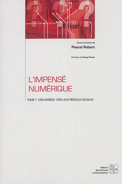 L’informatique se dilue désormais dans le vaste magma du numérique. Un numérique qui irrigue aujourd’hui les moindres replis de notre société, que ce soit dans les domaines professionnels, transactionnels, domestiques ou relationnels. Cette diffusion modifie-t-elle pour autant ce que nous avons appelé en 2 12 le mode d’existence idéologique des TIC? Cette dissémination permettrait-elle de sortir de ce que nous avions baptisé alors l’impensé informatique? Il semblerait que non. C’est en tout cas ce que montre ce livre en deux tomes, puisqu’il présente ce que l’on peut désormais appeler un véritable impensé numérique qui travaille à l’acceptation du numérique dans notre société, voire à un apprivoisement des usagers du numérique aux logiques qu’il instaure. Le premier tome de ce travail offre un panorama qui va des années 198 aux réseaux sociaux. Il teste l’hypothèse de l’impensé sur des « objets » comme la carte d’identité et le passeport informatisés, le bogue de l’an 2 , les rapports officiels, ou les notions-cadres de régulation?/ dérégulation. Il éclaire également d’un jour nouveau, toujours sous le révélateur de l’impensé, les pratiques du logiciel libre comme celles des réseaux sociaux, celles de Google comme celles du Web 2. .