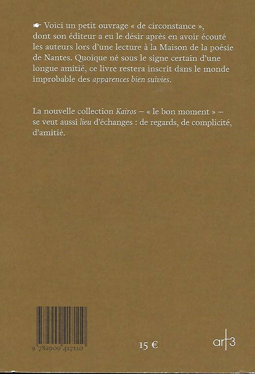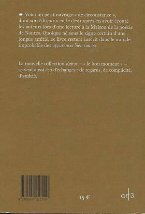 "Des apparences bien suivies, est un écho au superbe moment d’échange et de complicité entre ces deux amis<br /> d’enfance lors d’une conférence à Nantes."<br />