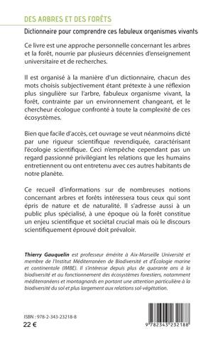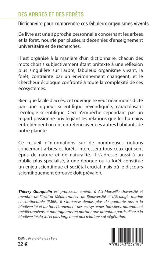 Cet ouvrage est une approche personnelle concernant les arbres et la forêt, nourrie par plusieurs décennies d’enseignement universitaire et de recherches. Il est organisé à la manière d’un dictionnaire, chacun des mots choisis étant prétexte à une réflexion plus singulière sur l’arbre, fabuleux organisme vivant, la forêt, contrainte par un environnement changeant, et le chercheur écologue confronté à toute la complexité de ces écosystèmes. Facile d’accès, ce recueil se veut néanmoins dicté par une rigueur scientifique revendiquée, caractérisant l’écologie scientifique. Ceci n’empêche cependant pas un regard passionné privilégiant les relations que les humains entretiennent ou ont entretenu avec ces autres habitants de notre planète. A notre époque, la forêt constitue un enjeu scientifique et sociétal crucial, et le discours scientifiquement doit prévaloir.