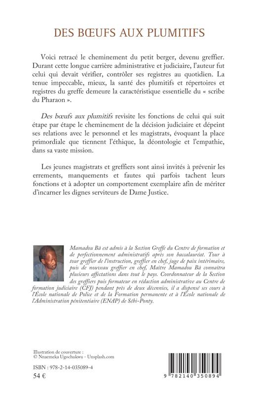 Voici retracé le cheminement du petit berger, devenu greffier. Durant cette longue carrière administrative et judiciaire, l'auteur fut celui qui devait vérifier, contrôler ses registres au quotidien. La tenue impeccable, mieux, la santé des plumitifs et répertoires et registres du greffe demeure la caractéristique essentielle du scribe du Pharaon . Des boeufs aux plumitifs revisite les fonctions de celui qui suit étape par étape le cheminement de la décision judiciaire et dépeint ses relations avec le personnel et les magistrats, évoquant la place primordiale que tiennent l'éthique, la déontologie et l'empathie, dans sa vaste mission. Les jeunes magistrats et greffiers sont ainsi invités à prévenir les errements, manquements et fautes qui parfois tachent leurs fonctions et à adopter un comportement exemplaire afin de mériter d'incarner les dignes serviteurs de Dame Justice.