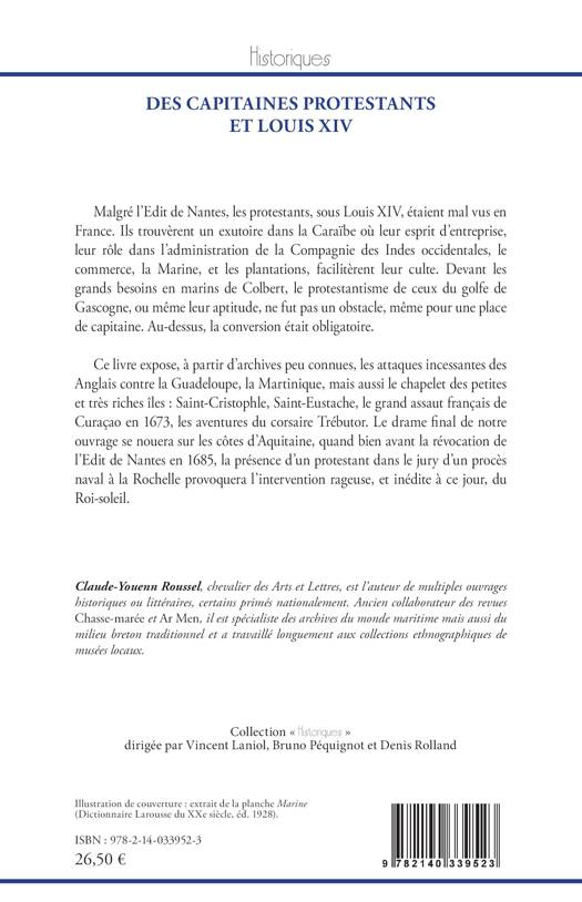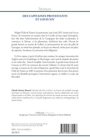 Malgré l'Edit de Nantes, les protestants, sous Louis XIV, étaient mal vus en France. Ils trouvèrent un exutoire dans la Caraïbe où leur esprit d'entreprise, leur rôle dans l'administration de la Compagnie des Indes occidentales, le commerce, la Marine, et les plantations, facilitèrent leur culte. Devant les grands besoins en marins de Colbert, le protestantisme de ceux du golfe de Gascogne, ou même leur aptitude, ne fut pas un obstacle, même pour une place de capitaine. Au-dessus, la conversion était obligatoire. Ce livre expose, à partir d'archives peu connues, les attaques incessantes des Anglais contre la Guadeloupe, la Martinique, mais aussi le chapelet des petites et très riches îles: Saint-Cristophle, Saint-Eustache, le grand assaut français de Curaçao en 1673, les aventures du corsaire Trébutor. Le drame final de notre ouvrage se nouera sur les côtes d'Aquitaine, quand bien avant la révocation de l'Edit de Nantes en 1685, la présence d'un protestant dans le jury d'un procès naval à la Rochelle provoquera l'intervention rageuse, et inédite à ce jour, du Roi-soleil.