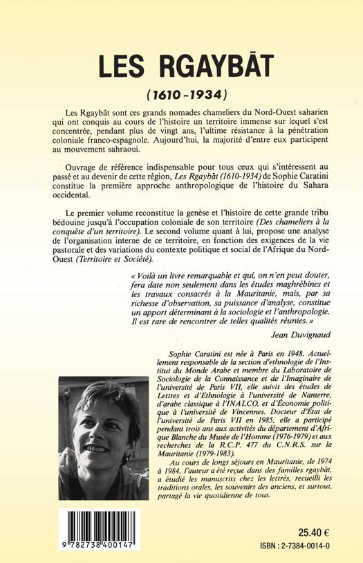 Les Rgaybat sont des grands nomades chameliers du Nord-Ouest saharien. Le premier volume reconstitue la genèse et l'histoire de cette grande tribu bédouine jusqu'à l'occupation coloniale de son territoire.