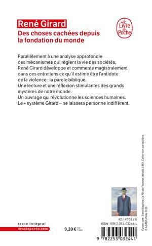 Un ouvrage qui révolutionne les sciences humaines. Parallèlement à une analyse approfondie des mécanismes qui règlent la vie des sociétés, René Girard développe et commente magistralement ce qu’il estime être l’antidote de la violence : la parole biblique. Une lecture et une réflexion stimulantes des grands mystères de notre monde. Le « système Girard » ne laissera personne indifférent.