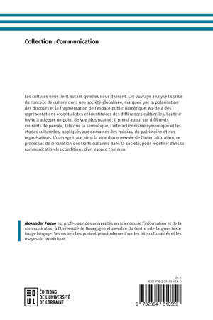 Les cultures nous lient autant qu'elles nous divisent. Cet ouvrage analyse la crise du concept de culture dans une société globalisée, marquée par la polarisation des discours et la fragmentation de l'espace public numérique. Au-delà des représentations essentialistes et identitaires des différences culturelles, l'auteur invite à adopter un point de vue plus nuancé. Il prend appui sur différents courants de pensée, tels que la sémiotique, l'interactionnisme symbolique et les études culturelles, appliqués aux domaines des médias, du patrimoine et des organisations. L'ouvrage trace ainsi la voie d'une pensée de l'interculturation, ce processus de circulation des traits culturels dans la société, pour redéfinir dans la communication les conditions d'un espace commun.