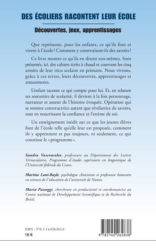 Que représente, pour les enfants, ce qu’ils font et vivent à l’école ? Comment y construisent-ils des savoirs ? Ce livre montre ce qu’ils en disent eux-mêmes. Sont présentés, ici, des cahiers écrits à chaud et couvrant les cinq années de leur vécu scolaire en primaire. Nous vivrons, grâce à ces textes, leurs découvertes, apprentissages et amusements.L’enfant raconte ce qui compte pour lui. Et, en relatant ses souvenirs de scolarité, il devient à la fois personnage, narrateur et auteur de l’histoire évoquée. Opération qui se montre constructrice autant que révélatrice de savoirs, tout en nourrissant la confiance et l’estime de soi. Un enseignement inédit sur ce que les jeunes élèves font de l’école telle qu’elle leur est proposée, comment ils y apprennent et pas toujours, ni seulement, ce qui constitue le « programme ».