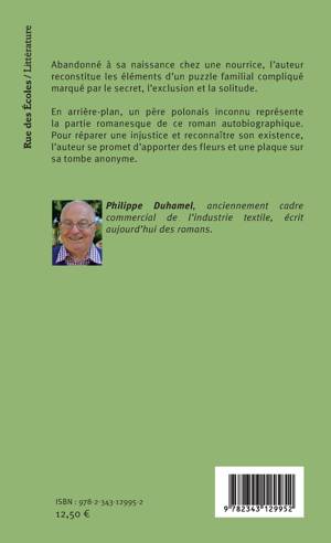 Abandonné à sa naissance chez une nourrice, l'auteur reconstitue les éléments d'un puzzle familial compliqué marqué par le secret, l'exclusion et la solitude. En arrière-plan, un père polonais inconnu représente la partie romanesque de ce roman autobiographique. Pour réparer une injustice et reconnaître son existence, l'auteur se promet d'apporter des fleurs et une plaque sur sa tombe anonyme.