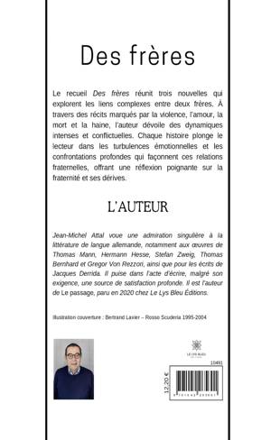 Le recueil Des frères réunit trois nouvelles qui explorent les liens complexes entre deux frères. À travers des récits marqués par la violence, l'amour, la mort et la haine, l'auteur dévoile des dynamiques intenses et conflictuelles. Chaque histoire plonge le lecteur dans les turbulences émotionnelles et les confrontations profondes qui façonnent ces relations fraternelles, offrant une réflexion poignante sur la fraternité et ses dérives.