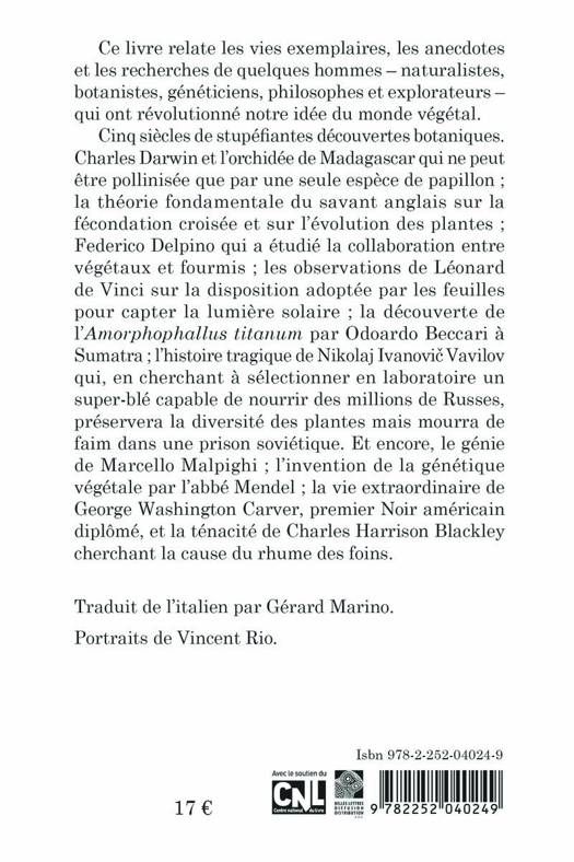 Ce livre relate les vies exemplaires, les anecdotes et les recherches de quelques hommes - naturalistes, botanistes, geneticiens, philosophes et explorateurs - qui ont revolutionne notre idee du monde vegetal. Cinq siecles de stupefiantes decouvertes botaniques. Charles Darwin et l'orchidee de Madagascar qui ne peut etre pollinisee que par une seule espece de papillon; la theorie fondamentale du savant anglais sur la fecondation croisee et sur l'evolution des plantes; Federico Delpino qui a etudie la collaboration entre vegetaux et fourmis; les observations de Leonard de Vinci sur la disposition adoptee par les feuilles pour capter la lumiere solaire; la decouverte de l'Amorphophallus titanum par Odoardo Beccari a Sumatra; l'histoire tragique de Nikolaj Ivanovi? Vavilov qui, en cherchant a selectionner en laboratoire un super-ble capable de nourrir des millions de Russes, preservera la diversite des plantes mais mourra de faim dans une prison sovietique. Et encore, le genie de Marcello Malpighi; l'invention de la genetique vegetale par l'abbe Mendel; la vie extraordinaire de George Washington Carver, premier Noir americain diplome, et la tenacite de Charles Harrison Blackley cherchant la cause du rhume des foins.