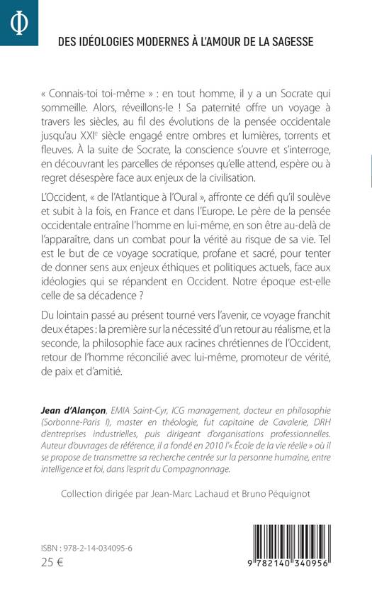Connais-toi toi-même: en tout homme, il y a un Socrate qui sommeille. Alors, réveillons-le ! Sa paternité offre un voyage à travers les siècles, au fil des évolutions de la pensée occidentale jusqu'au XXIe siècle engagé entre ombres et lumières, torrents et fleuves. À la suite de Socrate, la conscience s'ouvre et s'interroge, en découvrant les parcelles de réponses qu'elle attend, espère ou à regret désespère face aux enjeux de la civilisation. L'Occident, de l'Atlantique à l'Oural, affronte ce défi qu'il soulève et subit à la fois, en France et dans l'Europe. Le père de la pensée occidentale entraîne l'homme en lui-même, en son être au-delà de l'apparaître, dans un combat pour la vérité au risque de sa vie. Du lointain passé au présent tourné vers l'avenir, ce voyage franchit deux étapes: la première sur la nécessité d'un retour au réalisme, et la seconde, la philosophie face aux racines chrétiennes de l'Occident, retour de l'homme réconcilié avec lui-même, promoteur de vérité, de paix et d'amitié.