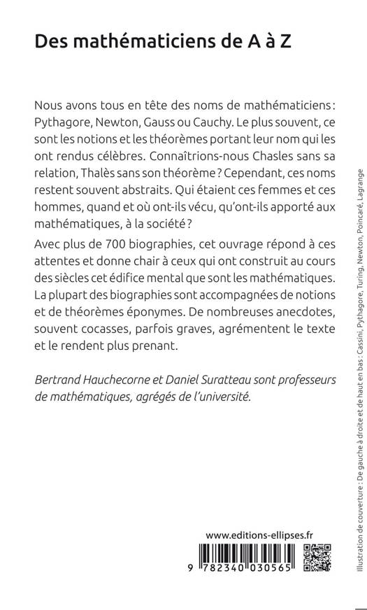 Avec plus de 700 biographies, cet ouvrage répond à ces attentes et donne chair à ceux qui ont construit au cours des siècles cet édifice mental que sont les mathématiques. La plupart des biographies sont accompagnées de notions et de théorèmes éponymes. De nombreuses anecdotes, souvent cocasses, parfois graves, agrémentent le texte et le rendent plus prenant.