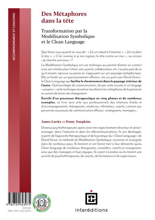 Que faites-vous quand on vous dit : « J’ai un nœud à l’estomac », « J’en ai plein le dos » « C’est comme si je me cognais la tête contre un mur » ou encore « Je cherche une issue » ? La Modélisation Symbolique est une technique qui permet d’entrer en contact avec son interlocuteur (client, ami, parent, collaborateur…) au plus près de ce qu’il ressent, éprouve ou pense en s’appuyant sur son paysage métaphorique. Elle se fonde sur un questionnement efficace, mis au point par David Grove : le Clean Language qui facilite le cheminement dans le paysage intérieur de l’autre. Outil privilégié de communication, de par cette écoute et ce langage « propres », cette technique novatrice transforme les métaphores de la personne en autant de leviers de changement. Enrichi d’un processus thérapeutique en cinq phases et de nombreux exemples, ce livre sera utile aux professionnels des relations d’aide et d’accompagnement, thérapeutes, médecins, infirmières, coachs, comme aux personnes soucieuses de communication efficace : enseignants, managers…