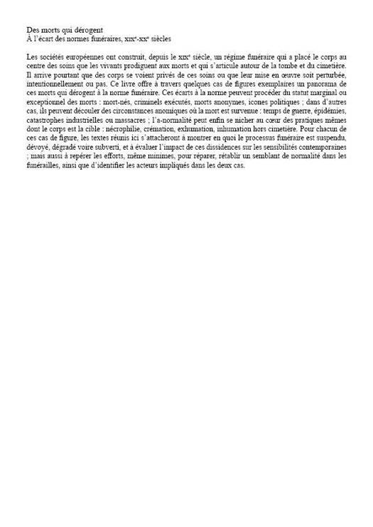 Les sociétés européennes ont construit, depuis le XIXe siècle, un régime funéraire qui a placé le corps au centre des soins que les vivants prodiguent aux morts et qui s’articule autour de la tombe et du cimetière. Il arrive pourtant que des corps se voient privés de ces soins ou que leur mise en œuvre soit perturbée, intentionnellement ou pas. Ce livre offre à travers quelques cas de figures exemplaires un panorama de ces morts qui dérogent à la norme funéraire. Ces écarts à la norme peuvent procéder du statut marginal ou exceptionnel des morts : mort-nés, criminels exécutés, morts anonymes, icones politiques ; dans d’autres cas, ils peuvent découler des circonstances anomiques où la mort est survenue : temps de guerre, épidémies, catastrophes industrielles ou massacres ; l’a-normalité peut enfin se nicher au cœur des pratiques mêmes dont le corps est la cible : nécrophilie, crémation, exhumation, inhumation hors cimetière. Pour chacun de ces cas de figure, les textes réunis ici s’attacheront à montrer en quoi le processus funéraire est suspendu, dévoyé, dégradé voire subverti, et à évaluer l’impact de ces dissidences sur les sensibilités contemporaines ; mais aussi à repérer les efforts, même minimes, pour réparer, rétablir un semblant de normalité dans les funérailles, ainsi que d’identifier les acteurs impliqués dans les deux cas.