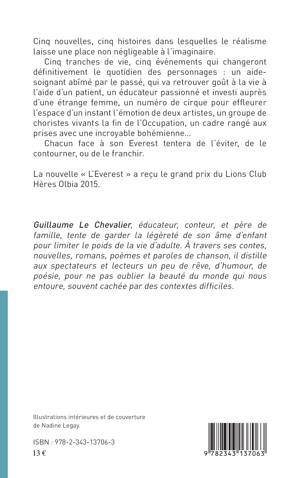 Cinq nouvelles dans lesquelles le réalisme laisse une place de taille à l'imaginaire. Cinq tranches de vie où un évènement change définitivement le quotidien des personnages. Un aide-soignant retrouve goût à la vie grâce à un patient ou encore un groupe de choristes vivants à la fin de l'Occupation... Chacun face à son Everest tentera de l'éviter, de le contourner ou de le franchir. Cet écrit a reçu le grand prix du Lions Club Héres Olbia 2015.