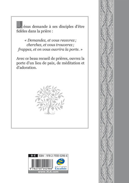 Jésus demande à ses disciples d’être fidèles dans la prière : « Demandez, et vous recevrez , cherchez, et vous trouverez , frappez, et on vous ouvrira la porte. » Avec ce beau recueil de prières, ouvrez la porte d’un lieu de paix, de méditation et d’adoration.