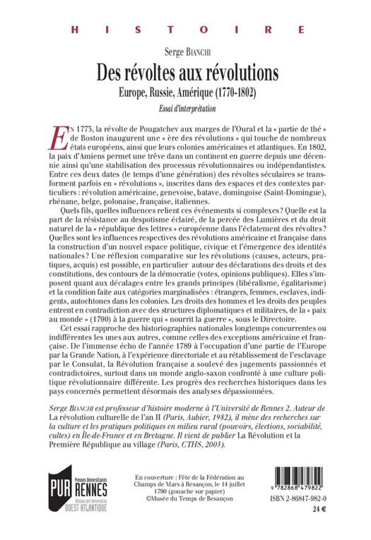 En 1773, la révolte de Pougatchev aux marges de l’Oural et la « partie de thé » de Boston inaugurent une « ère des révolutions » qui touche de nombreux états européens, ainsi que leurs colonies américaines et atlantiques. En 1802, la paix d’Amiens permet une trêve dans un continent en guerre depuis une décennie ainsi qu’une stabilisation des processus révolutionnaires ou indépendantistes. Entre ces deux dates (le temps d’une génération) des révoltes séculaires se transforment parfois en « révolutions », inscrites dans des espaces et des contextes particuliers : révolution américaine, genevoise, batave, domingoise (Saint-Domingue), rhénane, belge, polonaise, française, italiennes.