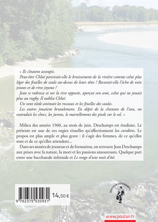 « Ils s’étaient assoupis. Peut-être Chloé percevait-elle le bruissement de la rivière comme celui plus léger des feuilles de saule au-dessus de leurs têtes ? Recevait-elle l’écho de voix jeunes et de rires joyeux ? Jean se redressa et, sur la rive opposée, aperçut son ami, celui qui ne jouait plus au rugby. Il oublia Chloé. Un vent tiède animait les roseaux et les feuilles des saules. Les autres jouaient brutalement. En dépit de la chanson de l’eau, on entendait les chocs, les jurons, le martèlement des pieds sur le sol. »