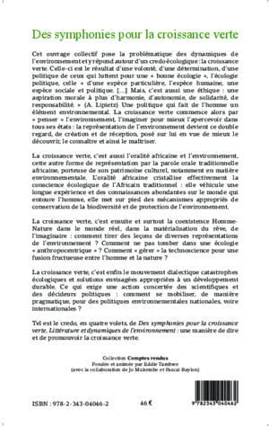 La croissance verte commence par "penser" l'environnement, par l'imaginer pour mieux l'apercevoir dans tous ses états. La croissance verte, c'est aussi l'oralité africaine : elle cristallise la conscience écologique de l'Africain traditionnel et véhicule des connaissances abondantes sur le monde qui nous entoure. La croissance verte, c'est la coexistence homme-nature dans le monde réel. La croissance verte, c'est enfin le mouvement dialectique catastrophes écologiques et solutions envisagées, appropriées à un développement durable.