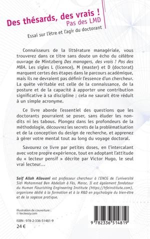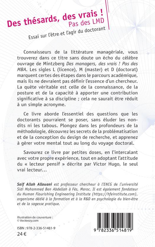 Connaisseurs de la littérature managériale, vous trouverez dans ce titre sans doute un écho du célèbre ouvrage de Mintzberg Des managers, des vrais ! Pas des MBA. Les sigles L (licence), M (master) et D (doctorat) marquent certes des étapes dans le parcours académique, mais ils ne devraient pas définir l'essence d'un chercheur. La quête véritable est celle de la connaissance, de la posture et de la capacité à apporter une contribution significative à sa discipline; cela ne saurait être réduit à un simple acronyme. Ce livre aborde l'essentiel des questions que les doctorants pourraient se poser, sans éluder les non-dits ni les tabous. Plongez dans les profondeurs de la méthodologie, découvrez les secrets de la problématisation et de la conception du design de recherche, et apprenez à gérer votre mental tout au long du voyage doctoral. Savourez ce livre par petites doses, en l'intercalant avec votre propre expérience, tout en adoptant l'attitude du lecteur pensif décrite par Victor Hugo, le seul vrai lecteur...