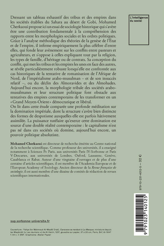 Dressant un tableau exhaustif des tribus et des empires dans les sociétés établies du Sahara au désert de Gobi, Mohamed Cherkaoui propose ici un essai de sociologie historique qui s’avère être une contribution fondamentale à la compréhension des rapports entre les morphologies sociales et les ordres politiques. Grâce à l’analyse méthodique des théories de la genèse de l’État et de l’empire, il infirme empiriquement la plus célèbre d’entre elles qui fonde leur avènement sur les conflits entre pasteurs et agriculteurs, et s’oppose à celles expliquant tout par la religion, les types de famille, d’héritage ou de contrats. Sa conception du conflit, qui met les tribus et les empires les unes en face des autres, se révèle particulièrement robuste lorsqu’elle est confrontée aux cas historiques de la tentative de romanisation de l’Afrique de Nord, de l’impérialisme arabo-musulman – et de son insuccès relatif –, ou du déclin des Almoravides et des Almohades. Aujourd’hui encore, la morphologie tribale des sociétés arabo-musulmanes et leur structure politique font obstacle aux tentatives des empires contemporains de les transformer en un « Grand Moyen-Orient » démocratique et libéral.