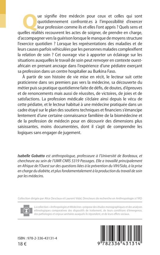 Que signifie être médecin pour ceux et celles qui sont quotidiennement confronté.es à l'impossibilité d'exercer leur profession comme ils et elles l'ont appris ? Quels sens et quelles réalités recouvrent les actes de soigner, de prendre en charge, d'accompagner vers la guérison lorsque le manque de moyens structure l'exercice quotidien ? Lorsque les représentations des maladies et de leurs causes parfois véhiculées par les personnes malades complexifient la relation de soin ? Cet ouvrage vise à apporter un éclairage sur les situations auxquelles le travail de soin peut renvoyer en contexte ouest-africain en prenant ancrage dans l'expérience d'une pédiatre exerçant sa profession dans un centre hospitalier au Burkina Faso. À partir de son histoire de vie mise en récit, le lecteur suit cette praticienne dans ses premiers pas vers la médecine, sa découverte du métier puis sa pratique quotidienne faite de défis, de doutes, d'épreuves et de renoncements mais aussi de réussites, de victoires, de joies et de satisfactions. La profession médicale s'éclaire ainsi depuis le vécu de cette pédiatre, et le lecteur habitué à une médecine pratiquée dans un cadre étayé sur le plan des soutiens techniques et financiers s'émancipe lentement d'une certaine connaissance familière de la biomédecine et de la profession de médecin pour en découvrir des dimensions plus saisissantes, moins documentées, dont il s'agit de comprendre les logiques sans engager de jugement.
