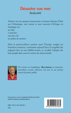 Désastre vue mer propose instantanés et instants damnés d'hier sur l'Atlantique, mer miroir et mer mouroir d'Afrique en Amérique via nos îlots si mal lotis sous leur ciel sur pilotis de cocotiers. Mais la poésurveillance montre aussi l'Europe malgré ses frontières sensitives, confrontée aujourd'hui à la tragédie des migrants face au mur-Méditerrannée, et, au-delà, l'épopée des "boat people" dans tous les océans du chaos-monde.