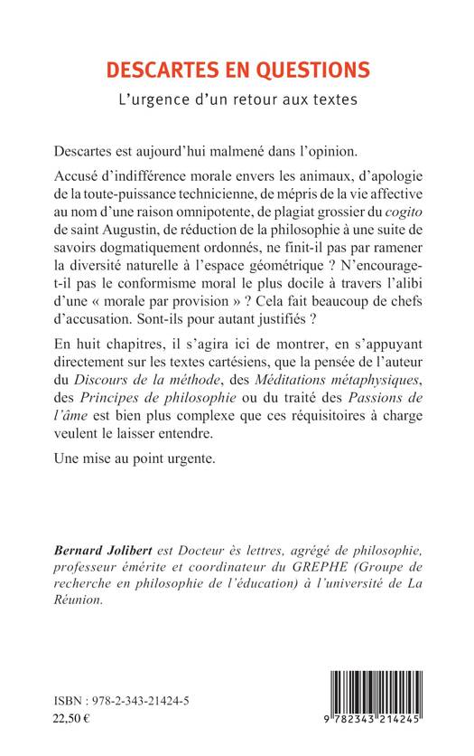 Descartes est aujourd'hui malmené dans l'opinion. Accusé d'indifférence morale envers les animaux, d'apologie de la toute-puissance technicienne, de mépris de la vie affective au nom d'une raison omnipotente, de plagiat grossier du cogito de saint Augustin, de réduction de la philosophie à une suite de savoirs dogmatiquement ordonnés, ne finit-il pas par ramener la diversité naturelle à l'espace géométrique ? N'encourage-t-il pas le conformisme moral le plus docile à travers l'alibi d'une « morale par provision » ? Cela fait beaucoup de chefs d'accusation. Sont-ils pour autant justifiés ? Cet ouvrage montre que la pensée de Descartes est plus complexe que ce que l'on rapporte.