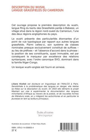 Cet ouvrage propose la première description du wushi, langue Ring du bantu des Grassfields parlée à Babessi, un village situé dans la région nord-ouest du Cameroun, l’une des deux régions anglophones du pays. Le wushi présente des particularités étonnantes d’un point de vue typologique par rapport aux autres langues grassfields. Parmi celles-ci, son système de classes nominales presque exclusivement constitué de suffixes – au lieu de préfixes – et l’absence d’accord dans la phrase : la position de ses constituants, quasi immuable, est par conséquent le marqueur par excellence des relations syntaxiques, avec l’ordre canonique SVO, dominant dans la famille Niger-Congo.