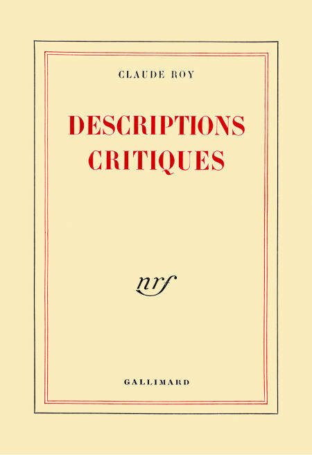 Par profession autant que par goût, Claude Roy est grand lecteur, et, c'est son Journal de lecteur qu'on peut lire sous le titre de Descriptions critiques. Successivement, Apollinaire, Mallarmé, Barrès, Valéry, Claudel, Martin du Gard, Duhamel, Supervielle, Giraudoux, Colette, Benda, Ramuz, Saint-John Perse, Aragon, Sartre, Éluard, Cocteau, Loys Masson, Malraux, Jean Prévost, Alain, Queneau, Fargue, Michaux, Prévert, Guillevic, Pierre Emmanuel font l'objet d'études, d'essais, où l'auteur, sans prendre la manière ni les manières du magister et en restant toujours d'un accès aisé, a su néanmoins pousser fort loin ses analyses, comprendre ses textes et se comprendre lui-même. "Sainte-Beuve voulait que la critique soit l'histoire naturelle des esprits. Ce n'est ici sans doute que l'histoire naturelle d'un esprit. L'auteur a fait feu de tout bois, et même du pire. L'important, en définitive, c'est de faire feu (quitte à se brûler)."