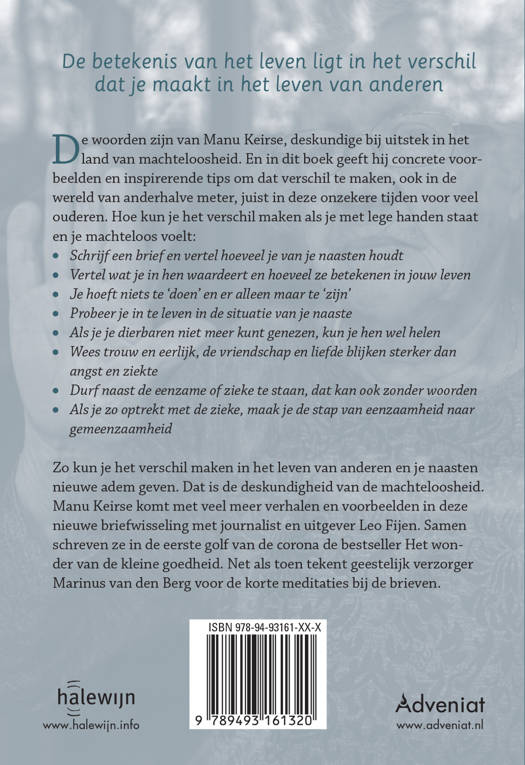 De betekenis van het leven ligt in het verschil dat je maakt in het leven van anderen De woorden zijn van Manu Keirse, deskundige bij uitstek in het land van machteloosheid. En in dit boek geeft hij concrete voorbeelden en inspirerende tips om dat verschil te maken, ook in de wereld van anderhalve meter, juist in deze onzekere tijden voor veel ouderen. Hoe kun je het verschil maken als je met lege handen staat en je machteloos voelt: ● Schrijf een brief en vertel hoeveel je van je naasten houdt ● Vertel wat je in hen waardeert en hoeveel ze betekenen in jouw leven ● Je hoeft niets te ‘doen’ en er alleen maar te ‘zijn’ ● Probeer je in te leven in de situatie van je naaste ● Als je je dierbaren niet meer kunt genezen, kun je hen wel helen ● Wees trouw en eerlijk, de vriendschap en liefde blijken sterker dan angst en ziekte ● Durf naast de eenzame of zieke te staan, dat kan ook zonder woorden ● Als je zo optrekt met de zieke, maak je de stap van eenzaamheid naar gemeenzaamheid Zo kun je het verschil maken in het leven van anderen en je naasten nieuwe adem geven. Dat is de deskundigheid van de machteloosheid. Manu Keirse komt met veel meer verhalen en voorbeelden in deze nieuwe briefwisseling met journalist en uitgever Leo Fijen. Samen schreven ze in de eerste golf van de corona de bestseller Het wonder van de kleine goedheid. Net als toen tekent geestelijk verzorger Marinus van den Berg voor de korte meditaties bij de brieven.