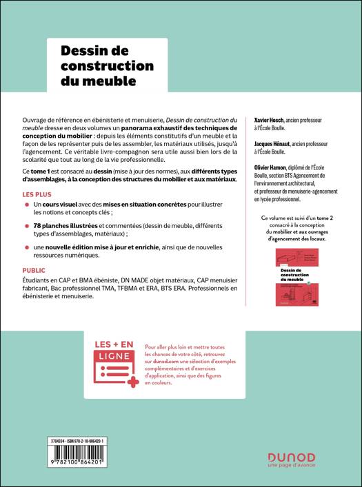 Ce tome 1 est consacré au dessin (mise à jour des normes), aux différents types d'assemblages, à la conception des structures du mobilier et aux matériaux.