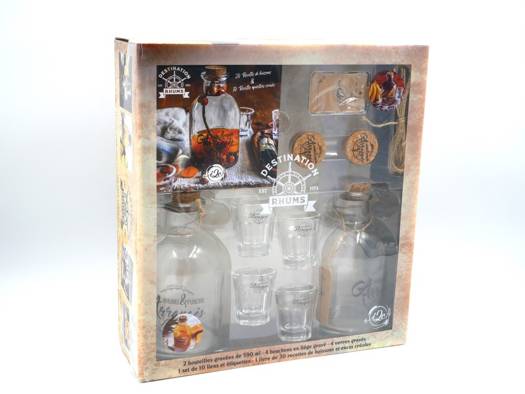 Les 20 recettes de rhums arrangés et de punchs sont à réaliser dans 2 bouteilles en verre gravée de 590 ml , et à déguster dans 4 verres gravés. Le coffret comprend également , 4 bouchons en liège et un jeu d'étiquettes et de liens en raphia !