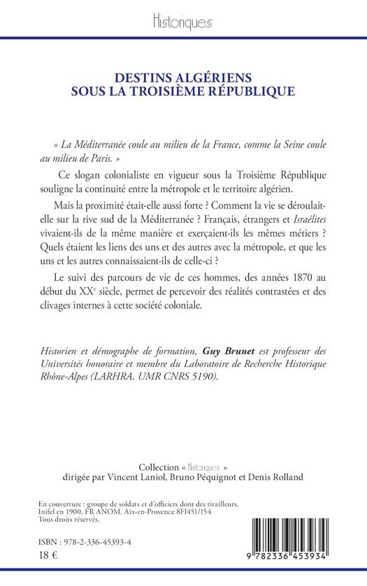 « La Méditerranée coule au milieu de la France, comme la Seine coule au milieu de Paris. » Ce slogan colonialiste en vigueur sous la Troisième République souligne la continuité entre la métropole et le territoire algérien. Mais la proximité était-elle aussi forte ? Comment la vie se déroulait-elle sur la rive sud de la Méditerranée ? Français, étrangers et Israélites vivaient-ils de la même manière et exerçaient-ils les mêmes métiers ? Quels étaient les liens des uns et des autres avec la métropole, et que les uns et les autres connaissaient-ils de celle-ci ? Le suivi des parcours de vie de ces hommes, des années 1870 au début du XX e siècle, permet de percevoir des réalités contrastées et des clivages internes à cette société coloniale.